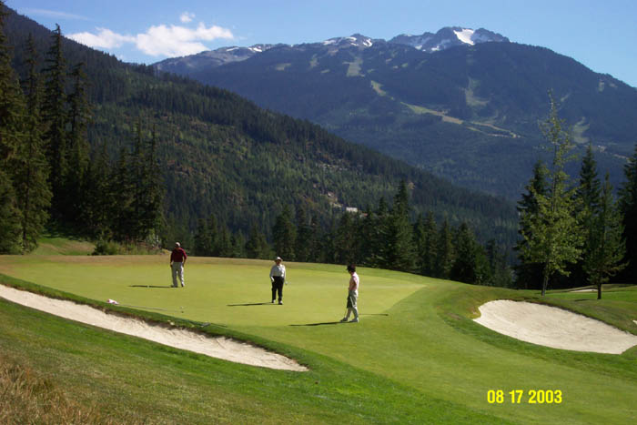 K. M. Shim, Mrs. Shim and Jane at a green of Chateau Whistler Golf Course.